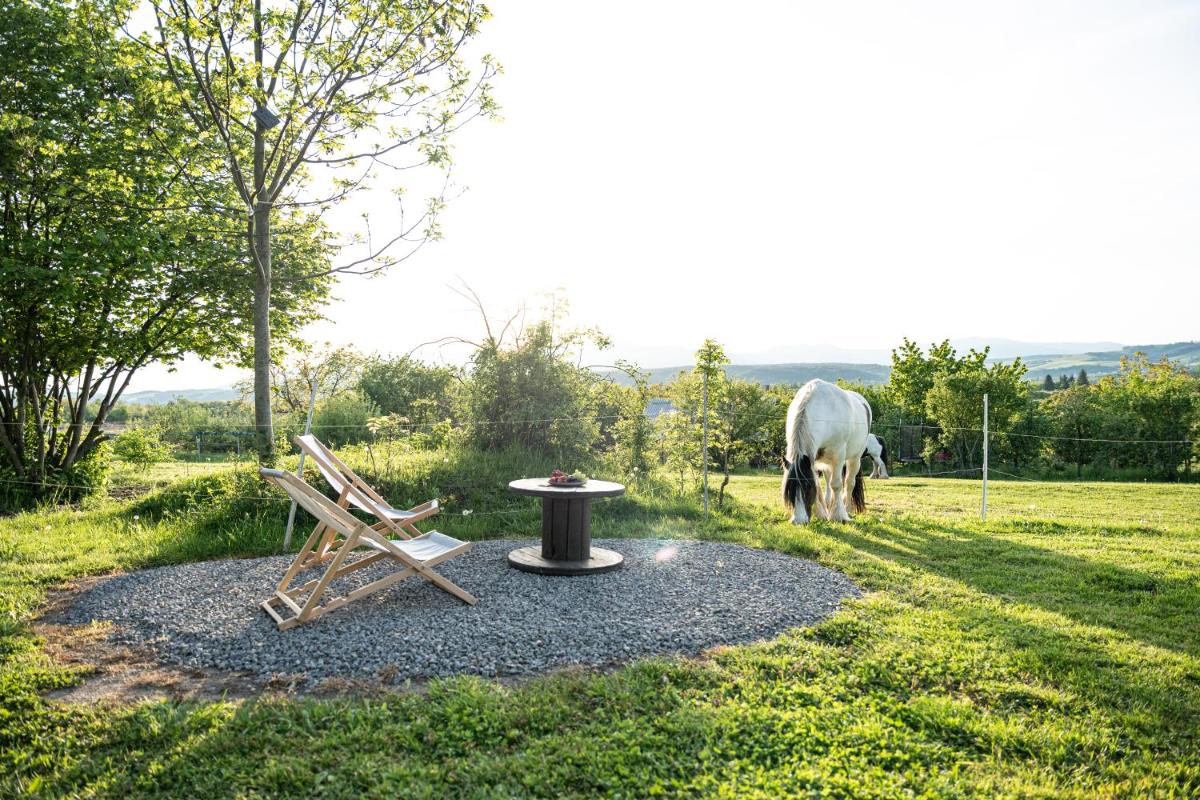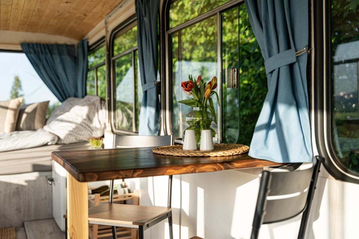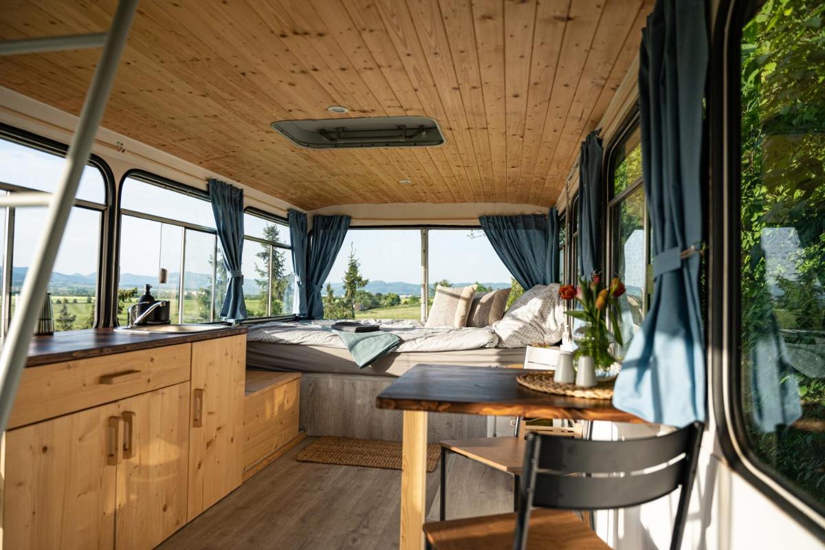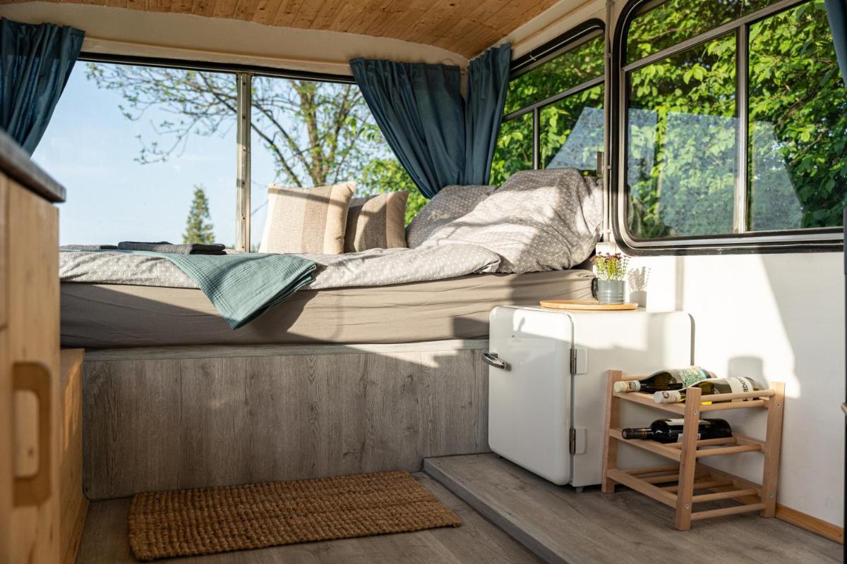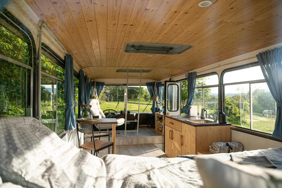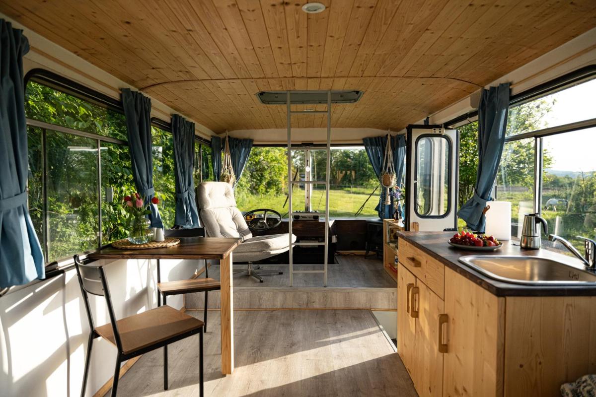 Los invitados en el autobús Ikarus pueden disfrutar del ciclismo cercano o aprovechar al máximo el jardín.