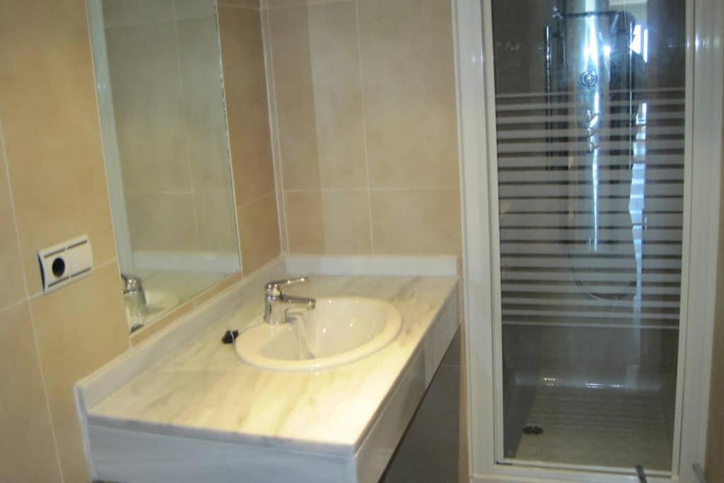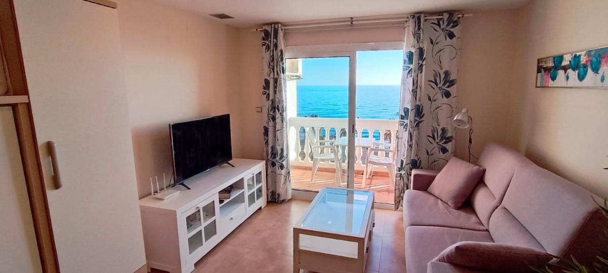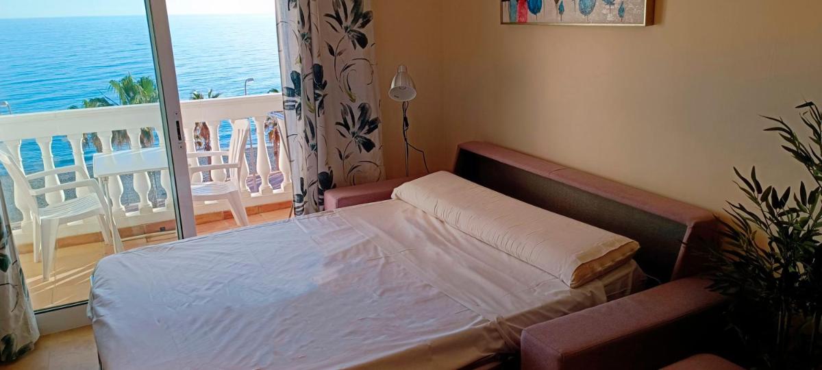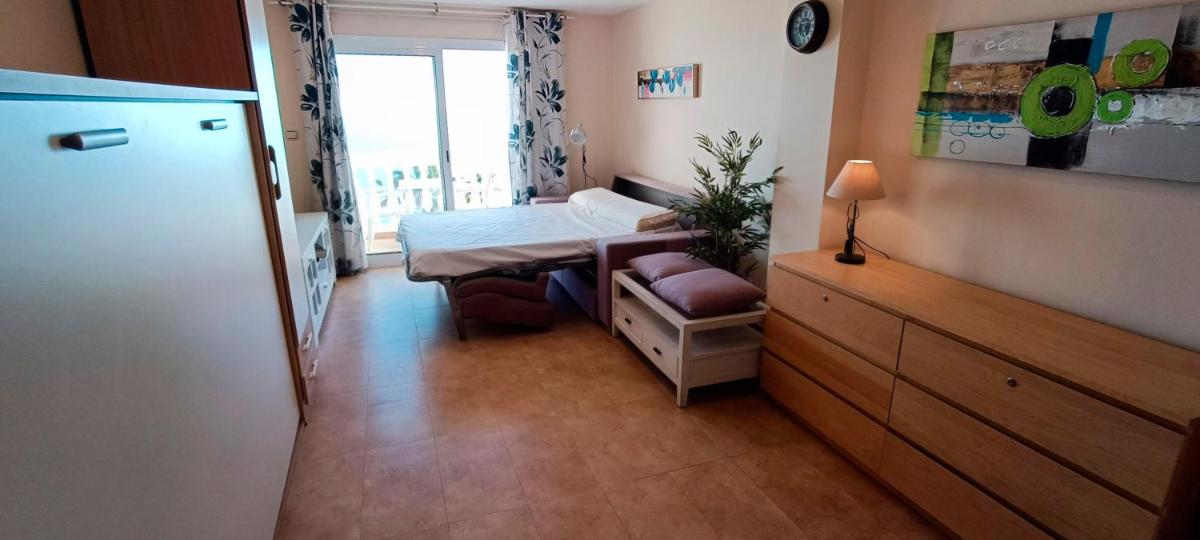 El Estudio Delante del Mar ofrece WiFi gratuito, acceso frente a la playa, baños privados, aire acondicionado, una cocina totalmente equipada, un comedor, un televisor de pantalla plana, un sofá cama y pisos de azulejos.