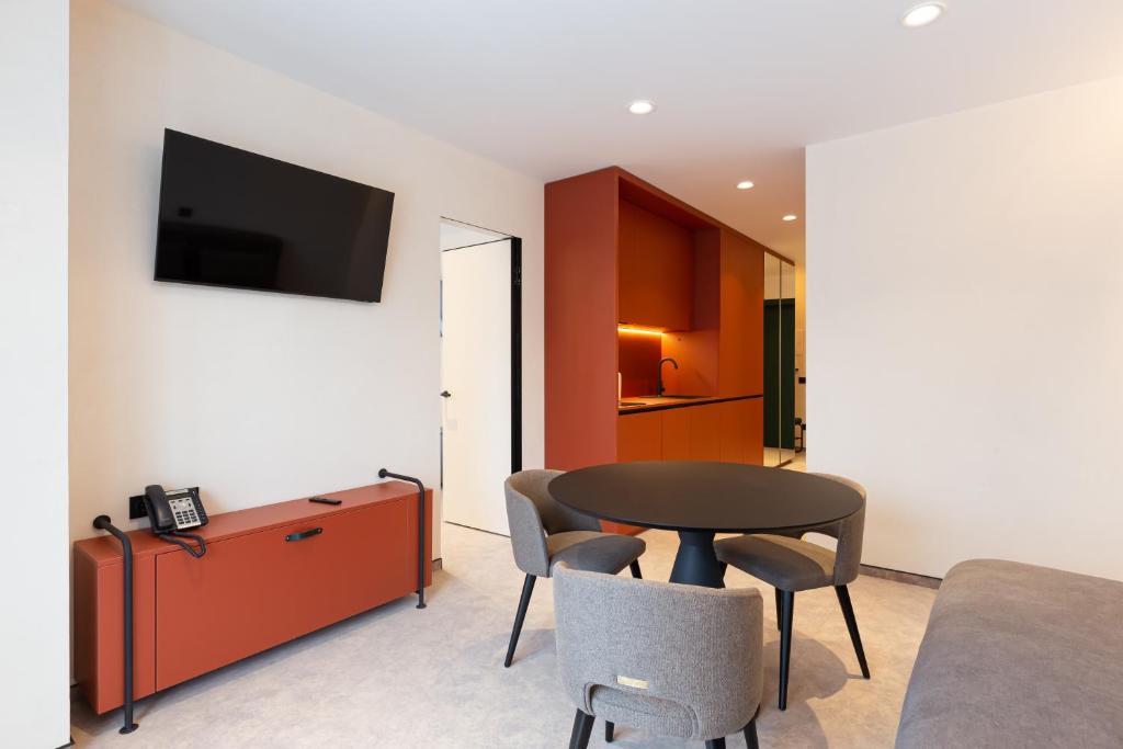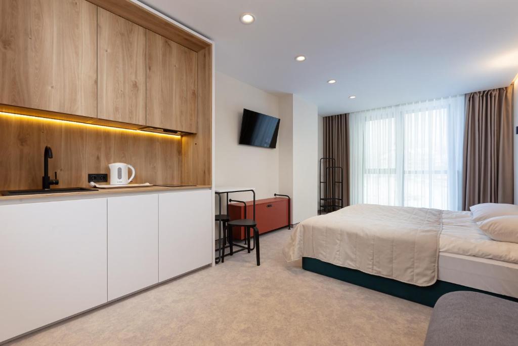 El alojamiento del hotel viene equipado con una decoración moderna, diseñada para proporcionar un retiro sereno para viajeros cansados. Cada unidad incluye un área de asiento, armario, teléfono y televisión de pantalla plana con numerosos canales de cable. Las cocinas están bien abastecidas por elementos esenciales, lo que permite a los huéspedes preparar comidas de forma independiente si lo desea.
