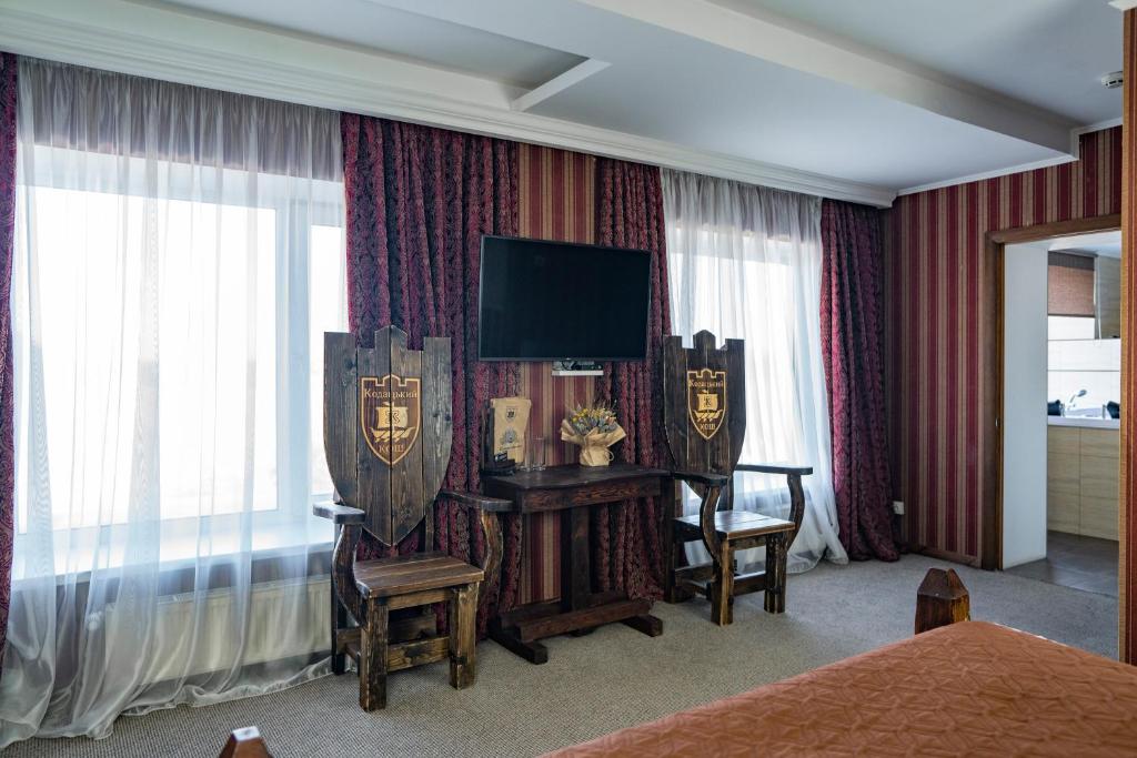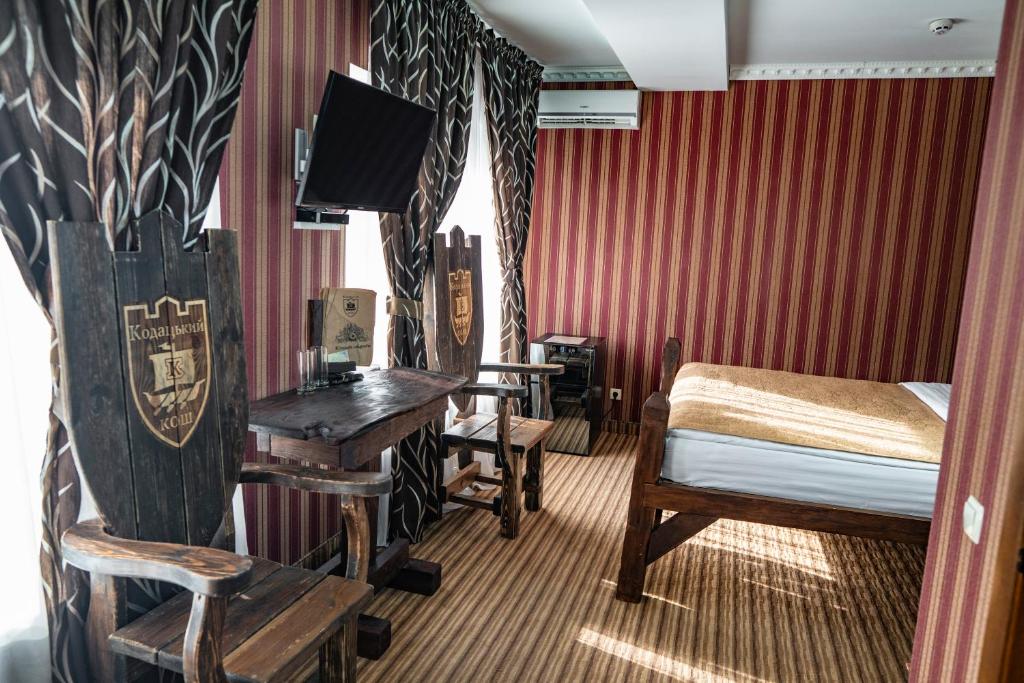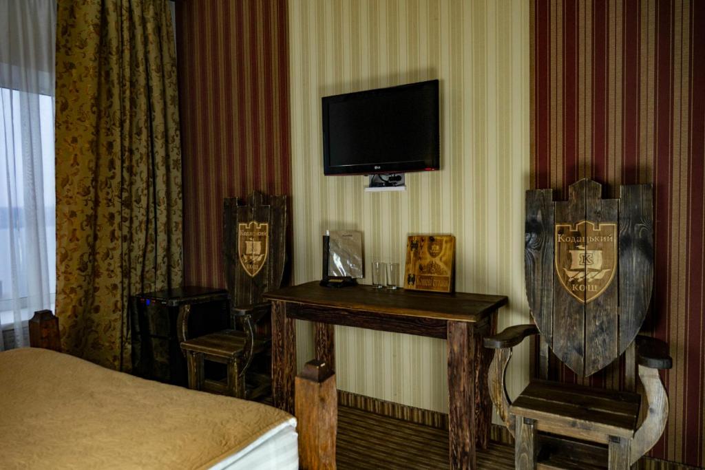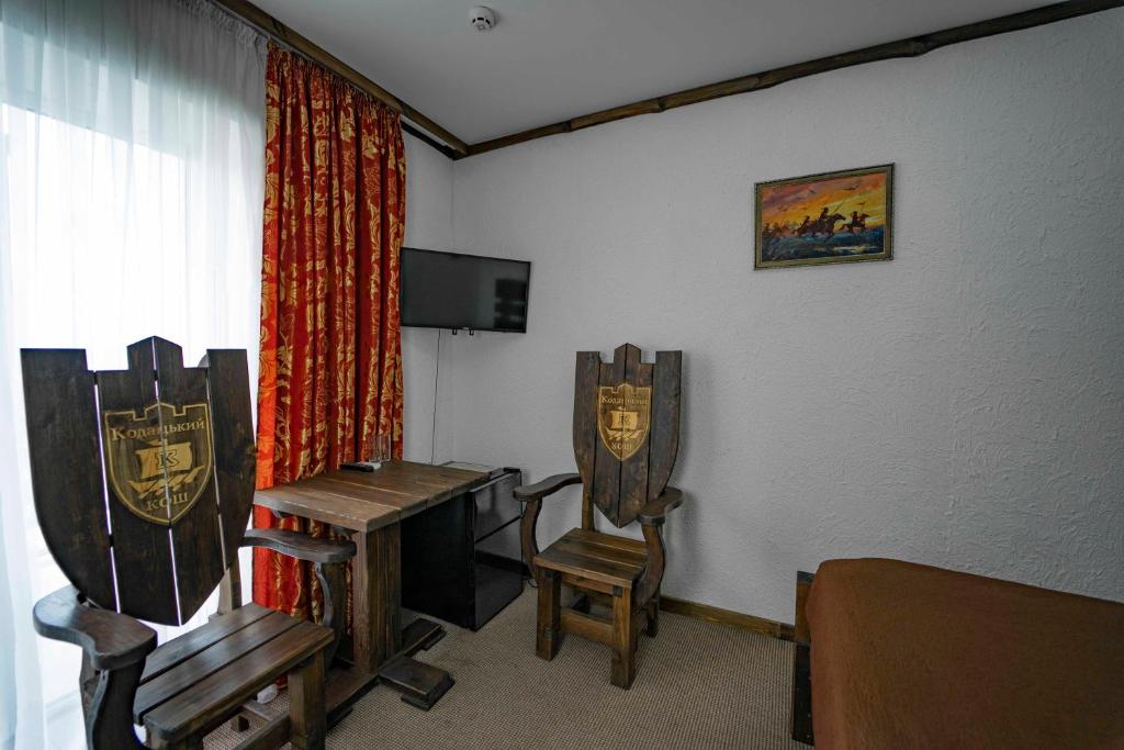 Kodatskiy Kosh ofrece un alojamiento cómodo a solo 13 km de la estación de tren de Dnipro Dnepropetrovsk Glavnyi. Esta propiedad moderna presenta servicios como un alquiler de bicicletas de cortesía, estacionamiento privado gratuito y una piscina al aire libre. Los invitados también disfrutan de un salón compartido y acceso a Wi-Fi gratuito en las instalaciones. Para aquellos que buscan entretenimiento adicional, el hotel cuenta con un restaurante, servicios de transporte gratuitos y servicio de habitaciones. Una terraza y la recepción 24/7 completan las instalaciones. Las habitaciones vienen equipadas con una cocina completamente funcional con un refrigerador, microondas y mini-bar. Un desayuno a la carta está disponible todos los días.