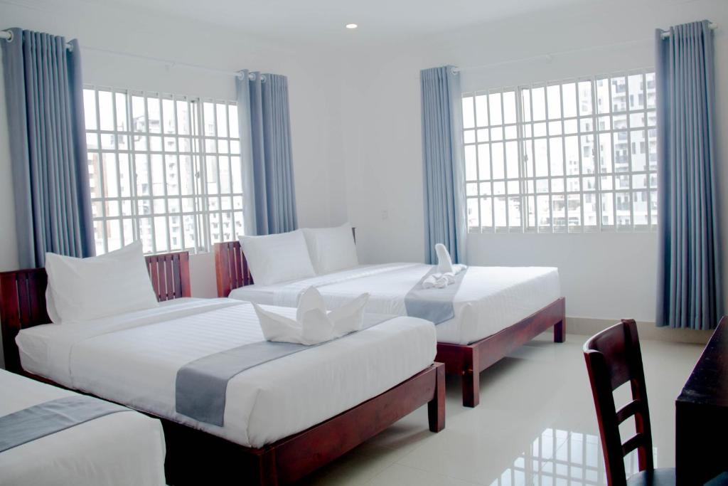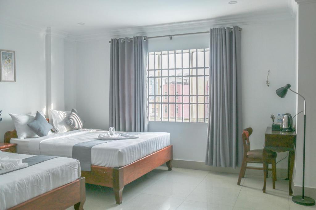 Cada unidad cuenta con comodidades esenciales, que incluyen aire acondicionado, televisores de pantalla plana con canales satelitales, refrigeradores, té eléctricos, duchas, artículos de tocador gratuitos y espaciosos armarios. Los baños privados vienen completos con zapatillas y opciones de visión de la ciudad, asegurando que los huéspedes tengan todo lo que necesitan para su estadía. Las opciones gastronómicas versátiles del hotel atienden a varios gustos, con un restaurante que sirve cocinas estadounidenses, camboyanas y chinas, junto con opciones vegetarianas a pedido.