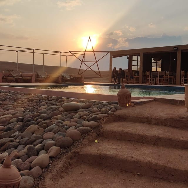Al llegar al desierto de Agafay, experimente una exclusividad incomparable con acceso a la piscina de cortesía y vistas impresionantes.Después de esto, relájate en medio de nuestro encantador campamento, donde te espera una suntuosa comida marroquí, acompañada de actuaciones animadas de música en vivo a medida que el sol desciende detrás del horizonte.