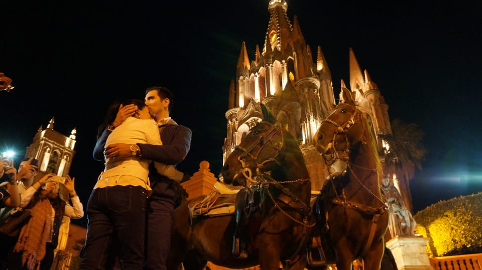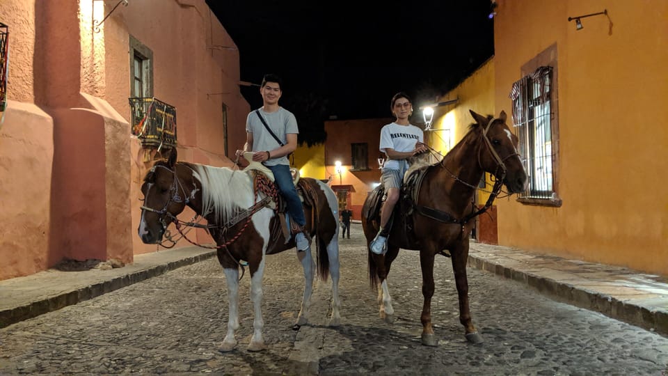 Explore el encantador ambiente de San Miguel de Allende a través de un íntimo viaje a caballo por la noche.Maravílate ante la impresionante vista del sol que se sumerge debajo del horizonte mientras atraviesas los pintorescos alrededores.Admire las luces centelleantes que iluminan los caminos adoquinados de esta histórica ciudad colonial.